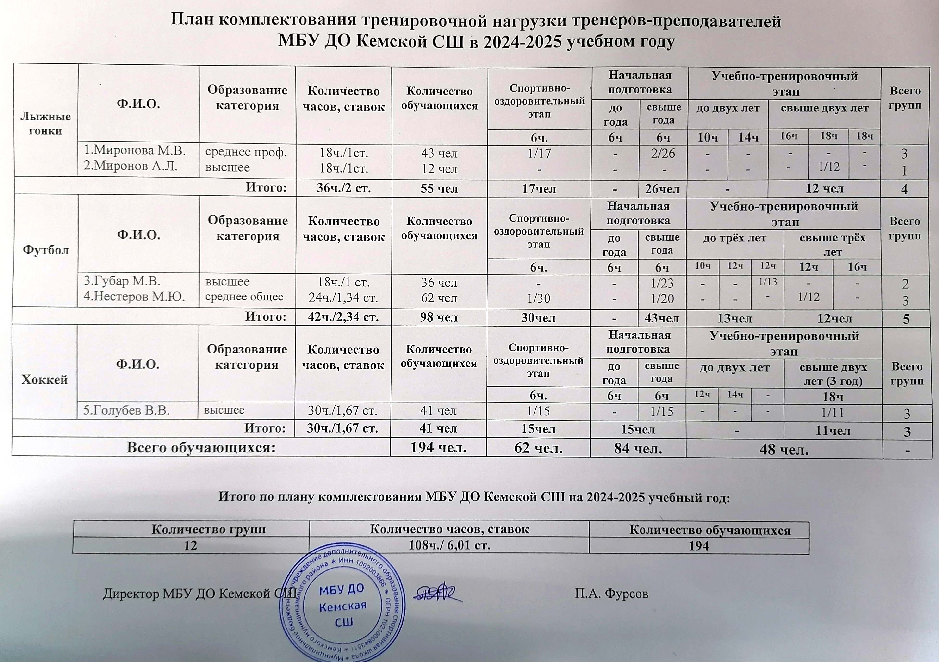 План комплектования тренировочной нагрузки тренеров-преподавателей 2024-2025 учебном году