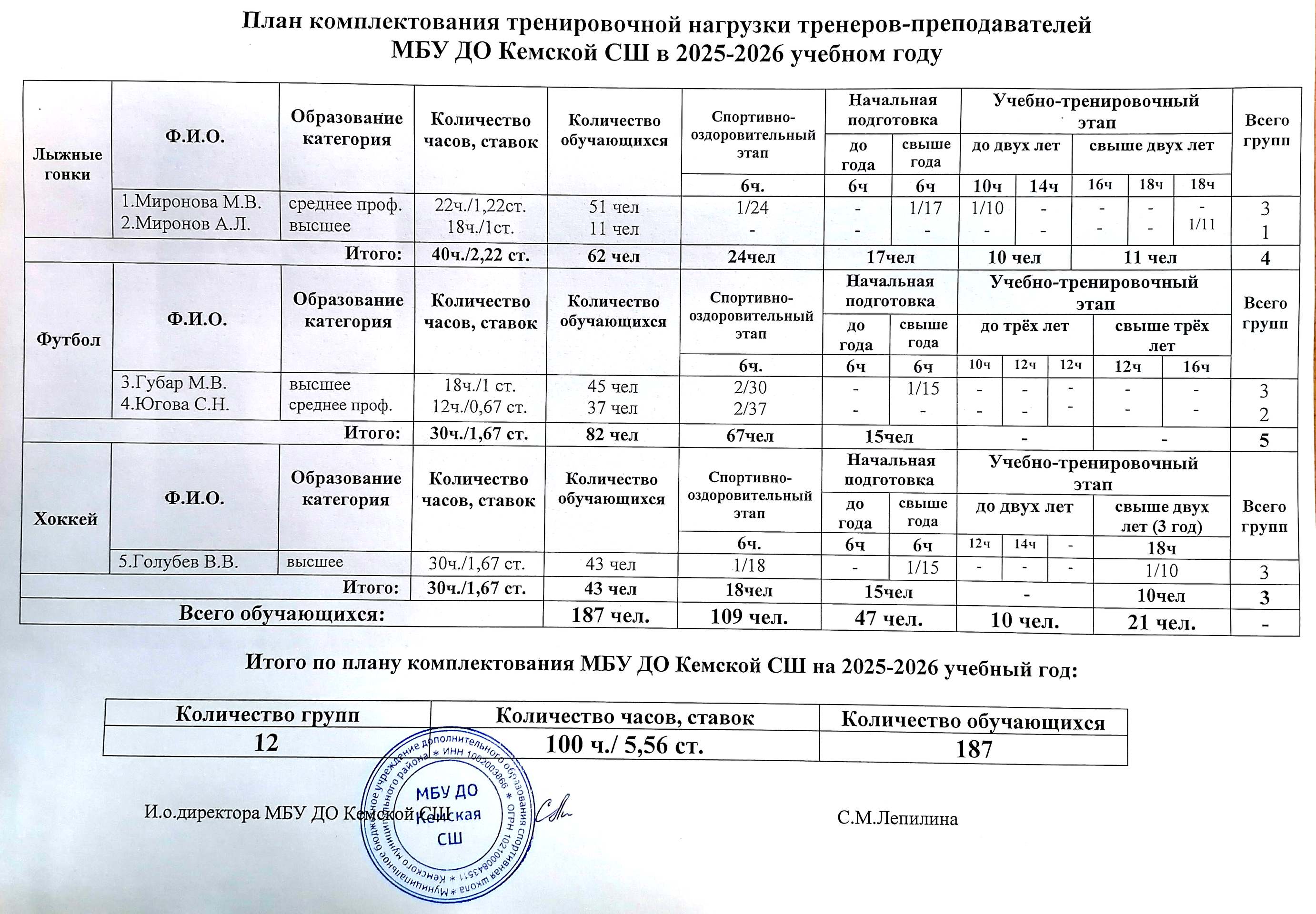 План комплектования тренировочной нагрузки тренеров-преподавателей 2025-2026 учебном году